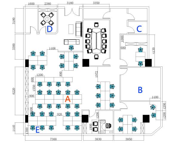 测试环境平面图如下,选用办公区域的A点作为路由器的位置,使用笔记本电脑依次测试点B、C、D、E所在区域。