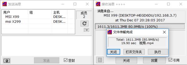 简单传输1个大约1.6GB的MP4格式视频文件,仅需大约20秒,速度为80.9MB/s,受到网卡驱动、网线和网络环境等影响,实际传输速度是难以达到千兆峰值的。